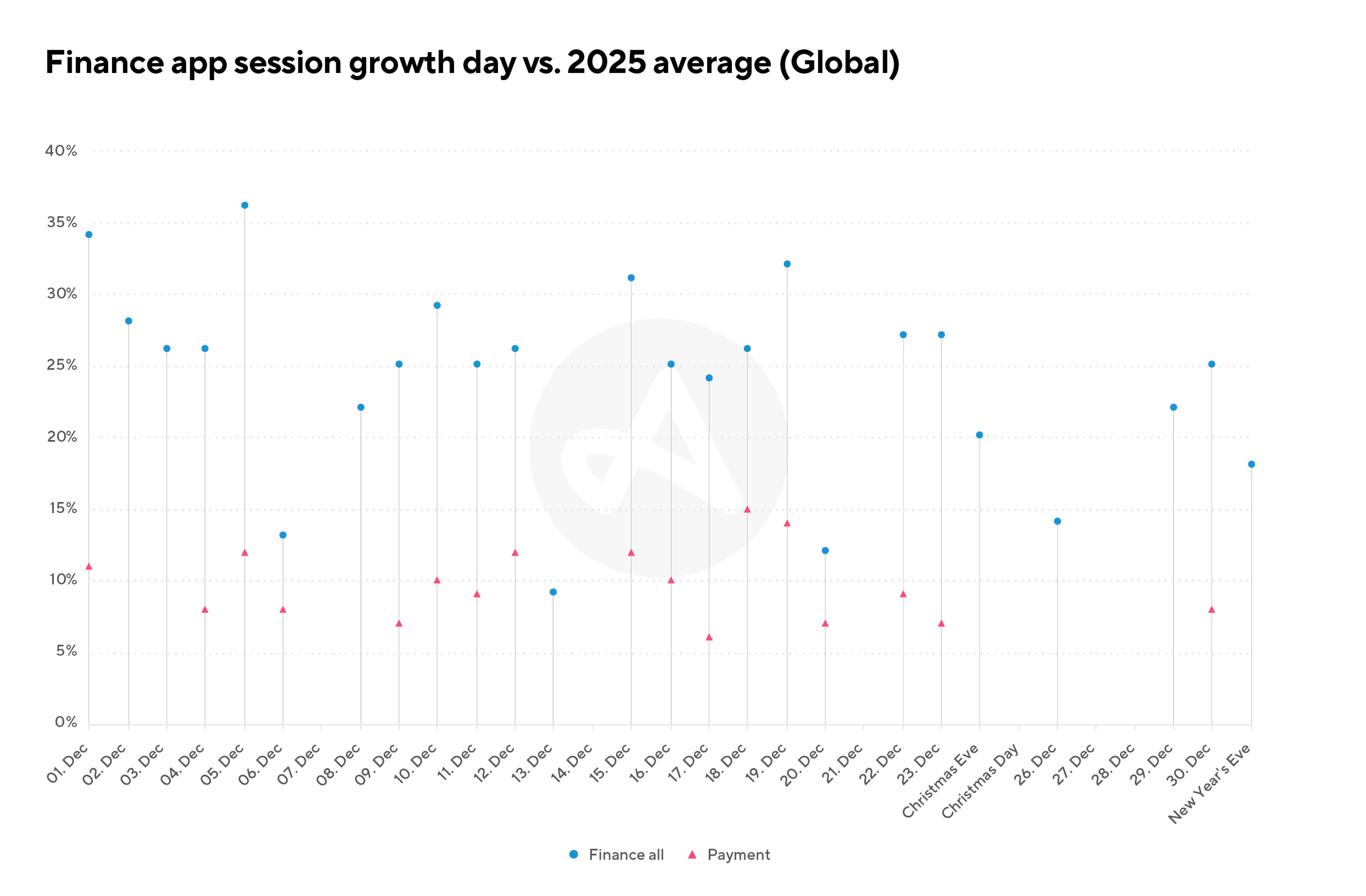 Across finance apps, session growth was highest in the weeks leading up to Christmas and declined during the festive period.