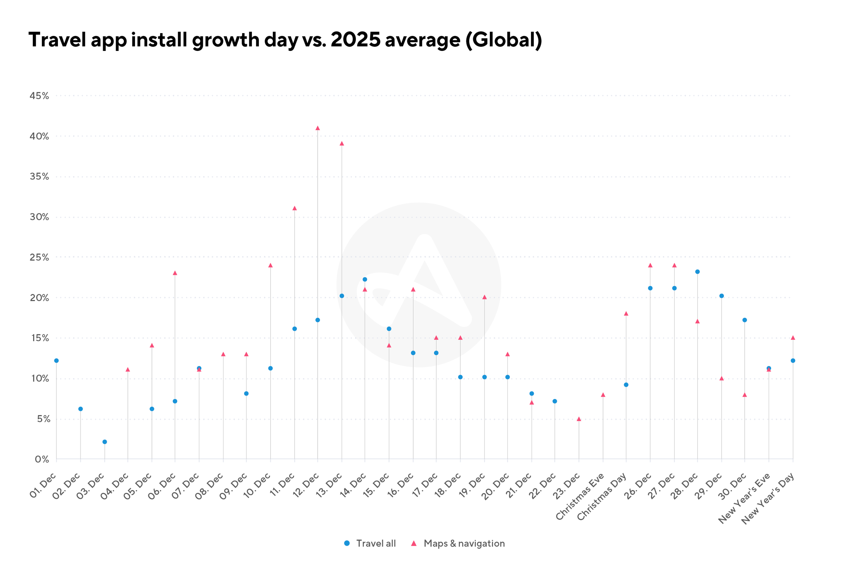 - Overall travel app installs grow post-Christmas, while maps and navigation increase earlier and stay elevated.