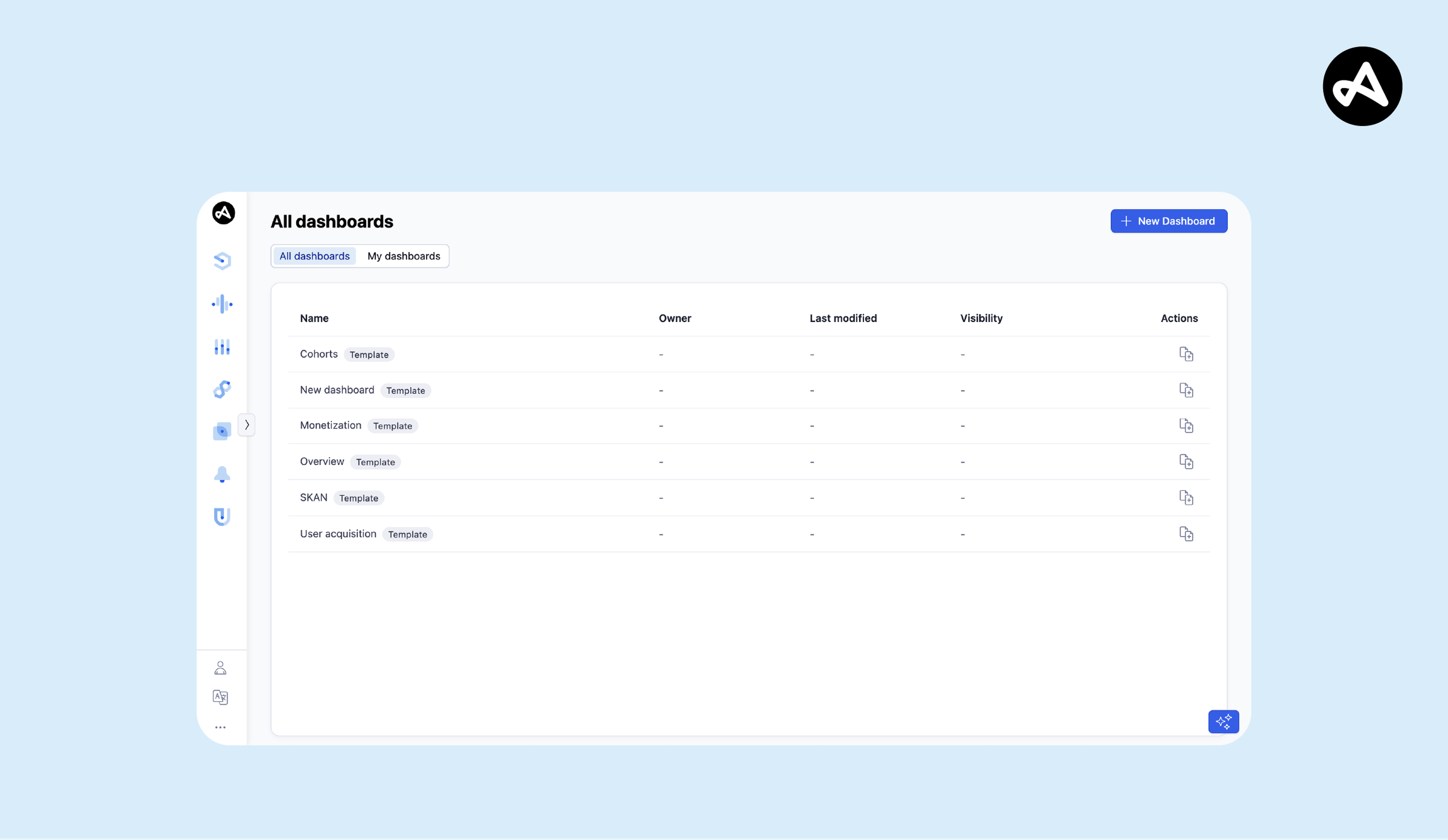 - Built-in templates: start from ready-made dashboards for overviews, UA, monetization, SKAN, and cohorts.