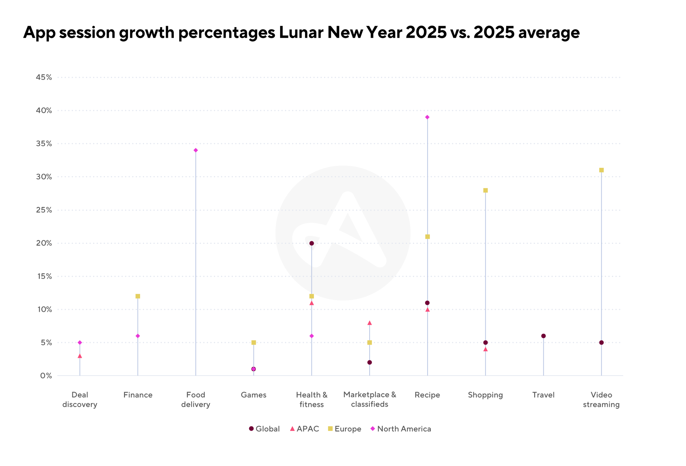 On Lunar New Year’s Day 2025, video streaming installs jumped 53% globally and 23% in Europe, versus the yearly average. Sessions rose 5% worldwide and 31% in Europe.