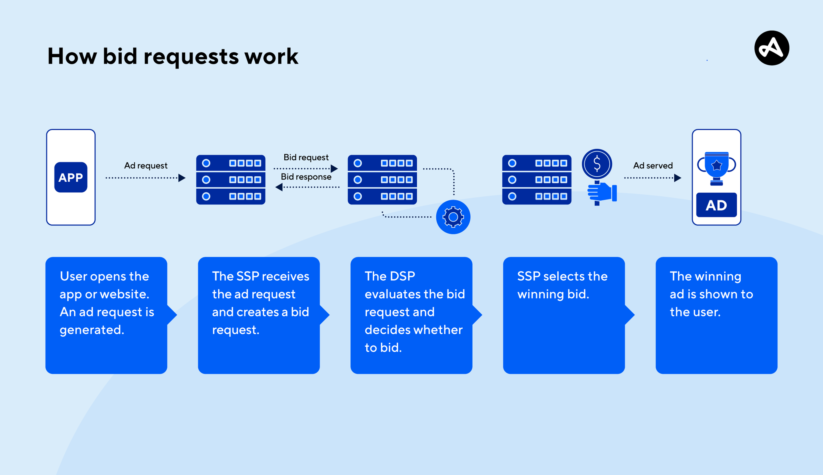 A bid request in programmatic advertising is a data message sent by an app’s ad server or supply-side platform (SSP) when ad space becomes available during an automated auction, also known as real-time bidding (RTB). It contains details about the user, device, and ad placement, so advertisers can decide whether to bid and how much to offer.