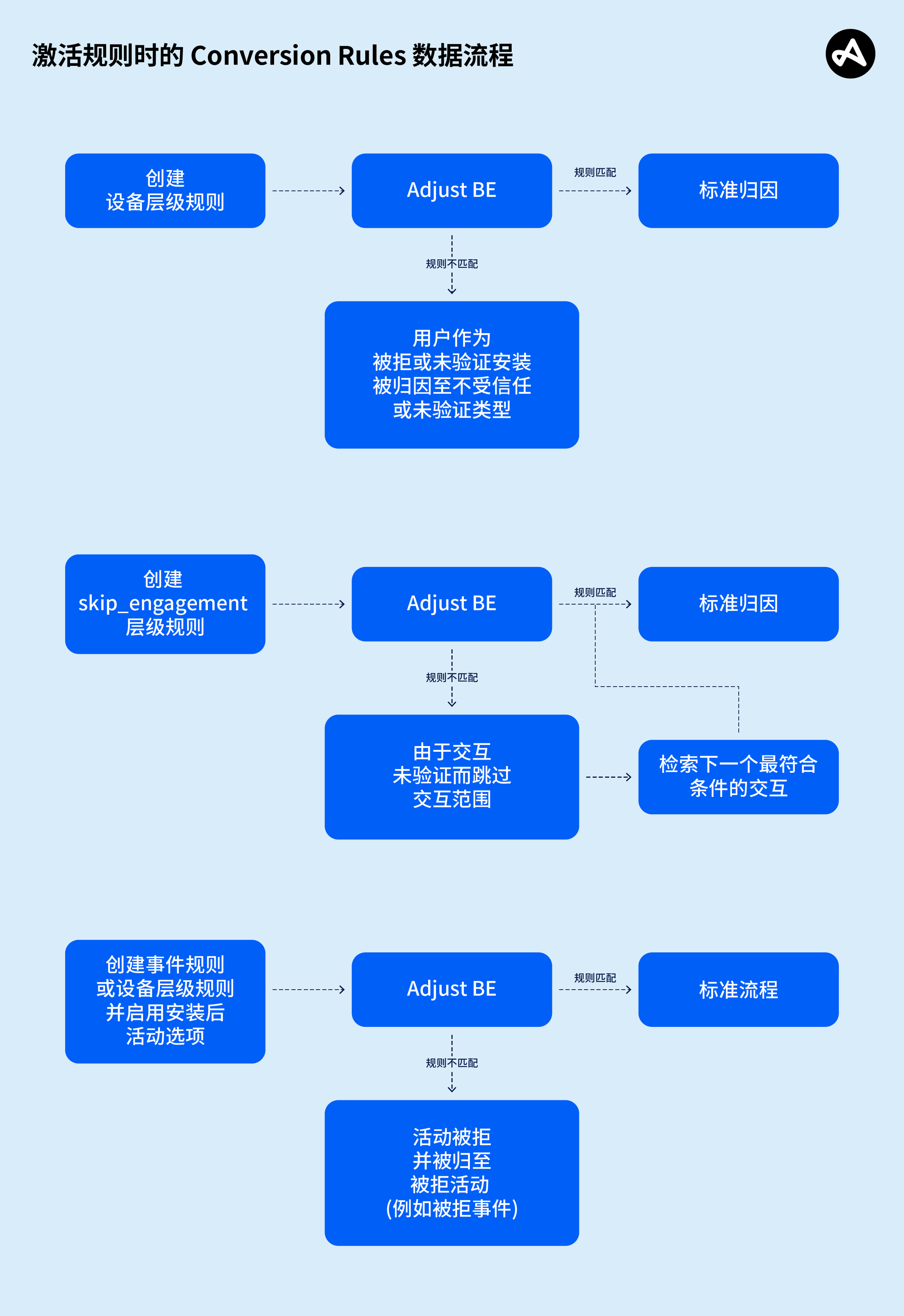 下图中直观展现了每种规则 (设备层级、跳过来源和事件/安装后活动) 的数据流。