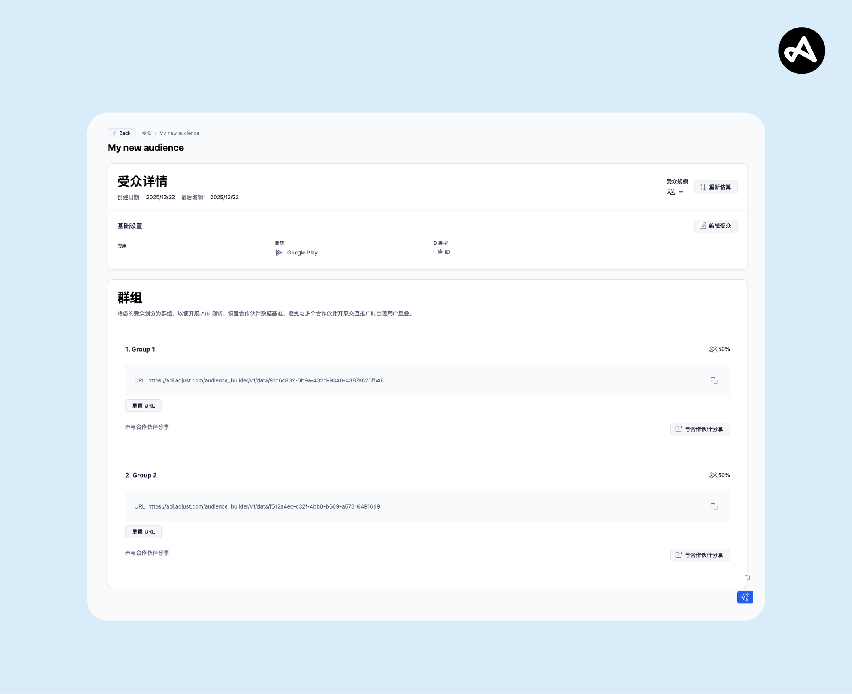 Adjust 为营销人员提供业内领先的解决方案,以实现精准的用户分群,并适应不断变化的用户行为。使用 Adjust Audiences,团队可以使用应用内事件、功能交互和生命周期里程碑等数据创建灵活的、以行为为导向的分群。受众列表会根据您设置的条件实时更新,在用户归因发生变化时自动添加或删除用户。Adjust 还提供安全的集成,以便与付费和自有渠道共享这些分群,确保合作伙伴平台始终收到最新的激活列表。