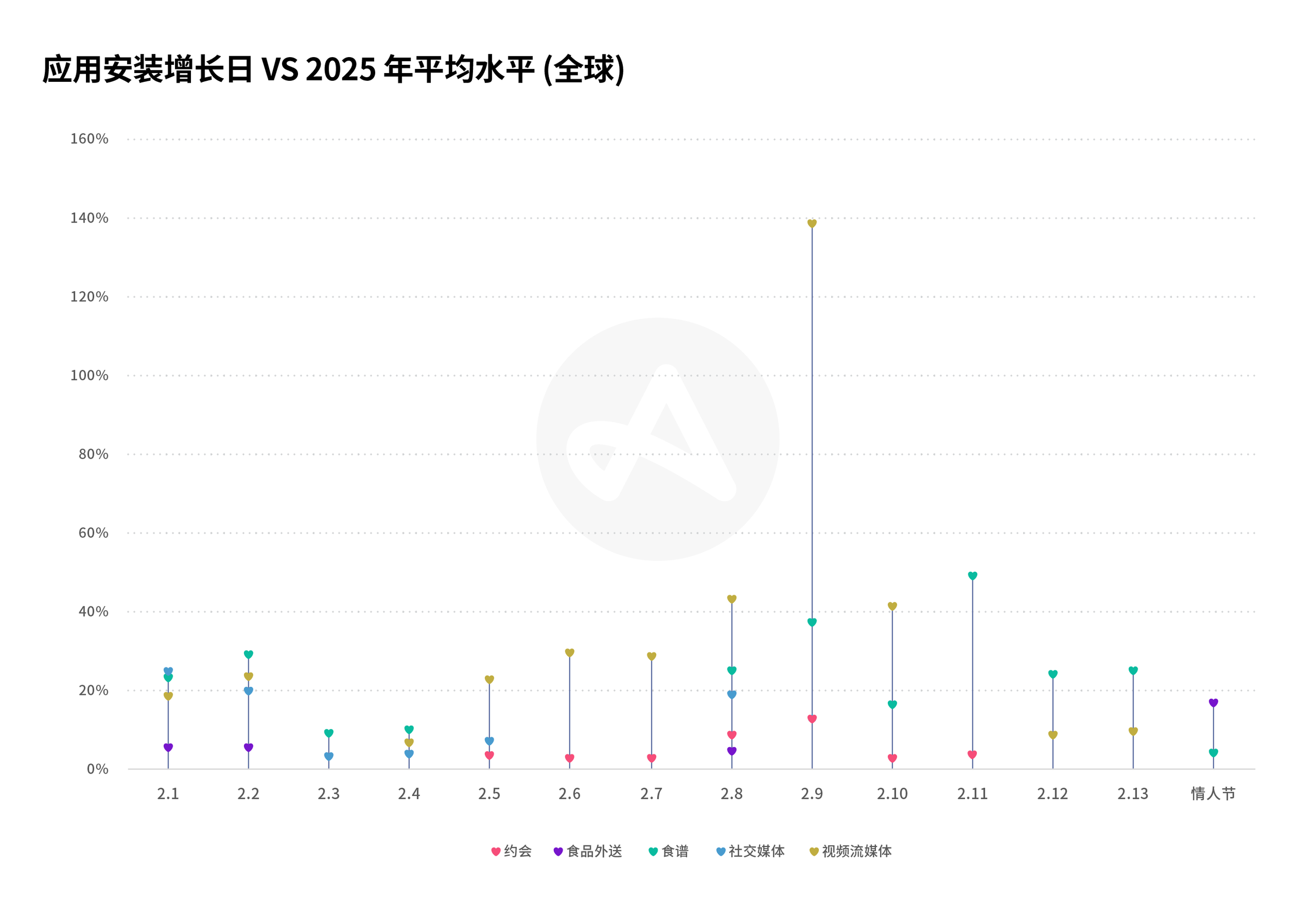 社交网络应用也提前受益。2 月 9 日安装量达到峰值,比平均值高出 37%;情人节前会话量稳步增长。